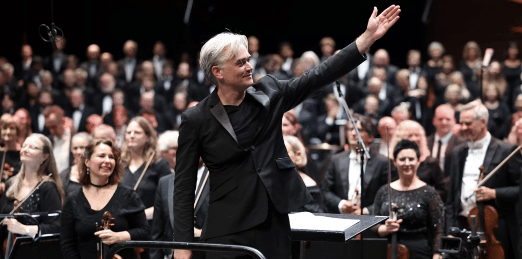 Bildet: Edward Gardner tar applaus etter sin siste konsert som sjefdirigent for Bergen Filharmoniske Orkester 5. juni 2024. Foto: Tarjei Hummelsund